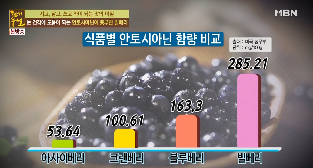 빌베리는 100그램당 350그램 정도의 안토시아닌을 함유하고