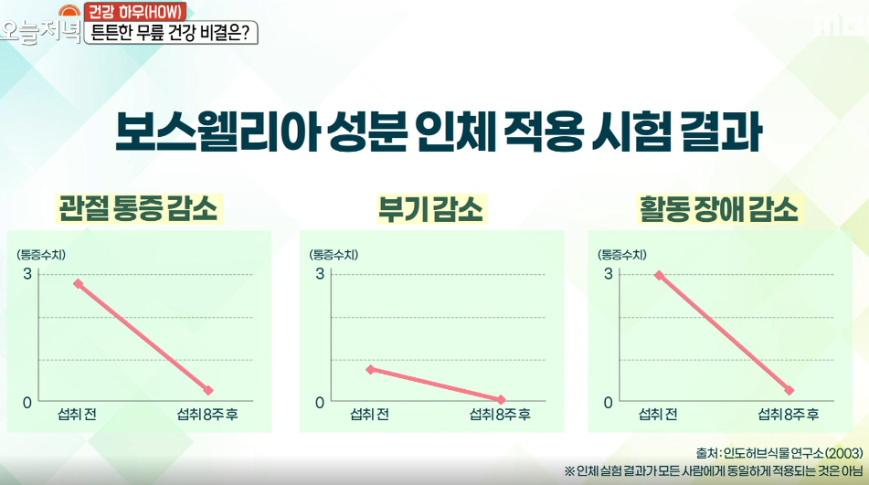 한국 식품 영양 과학지에 의하면 실험 동물군에 보스웰리아를 섭취 시