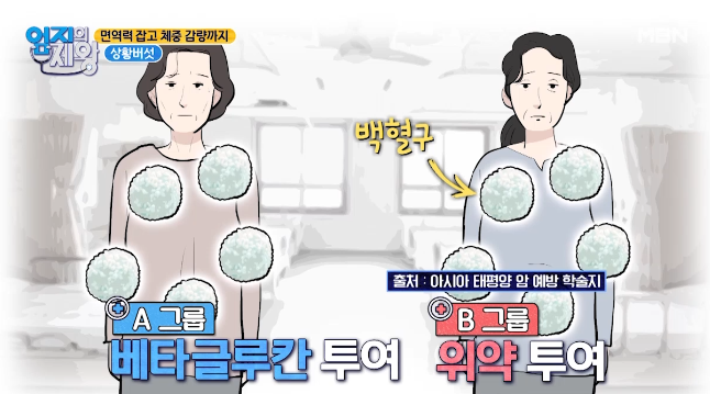 연구 결과에 의하면 유방암 환자 30명에게 베타글루칸 투여 후 백혈구 수치의 감소 폭이