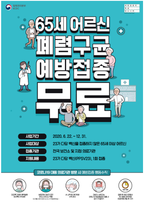 *65세 이상 어르신은 보건소에서 무료 예방접종(다당질백신 23가) 가능합니다.