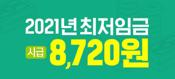 2021년 최저임금은 2020년 보다 1.5% 인상된 8,720원으로 결정 되었습니다.